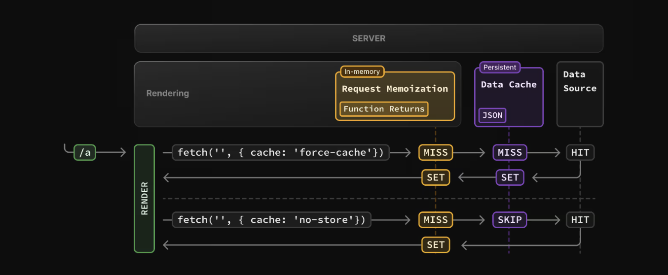 Use request memoization when you want to cache the response from requests made withΒ fetch. This is useful for components that make multiple requests to the server during a userβs request.