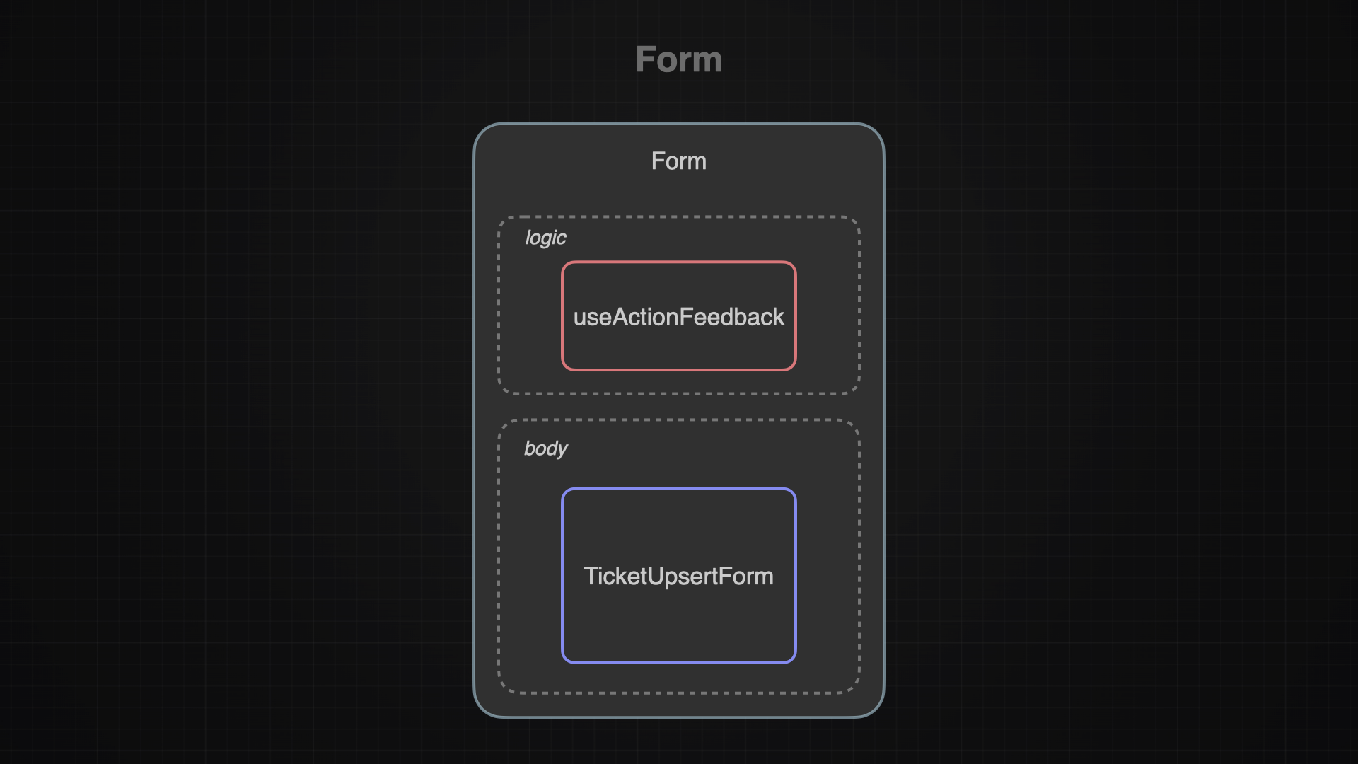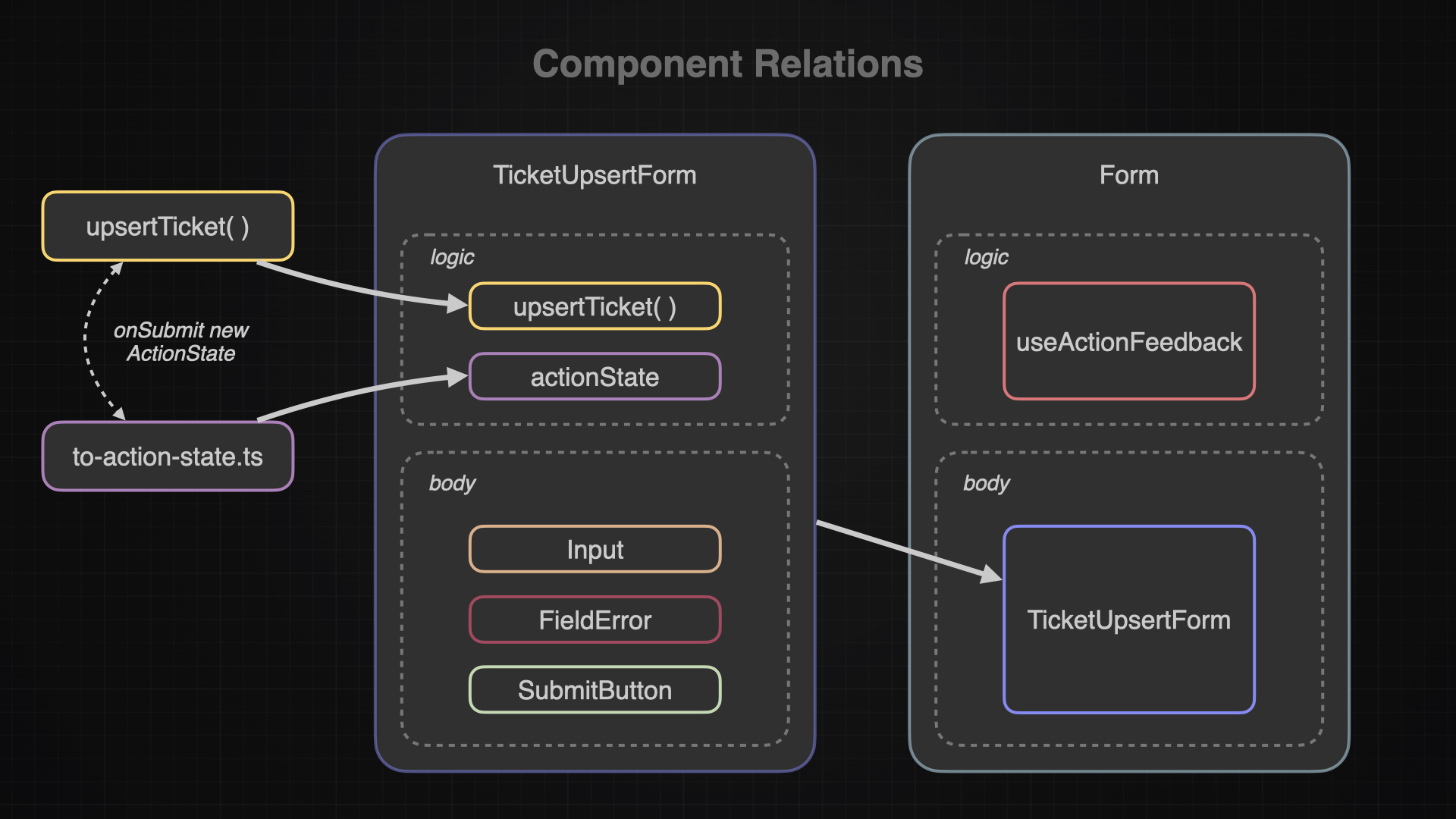 The ticketUpsertForm creates and manages the actionState. It acts as a single source of truth and all children will get the currentActionState form the TicketUpsertForm.