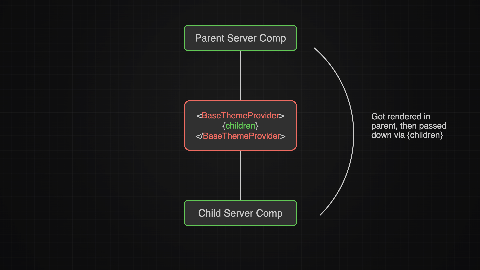A component gets created within a server component, therefore it becomes a server component itself. If that component now gets passed down to a client component via the {children} param, it still stays a server component. Why? Because the client component is only the adoptive parent, the real parent will always be the server component. This is called Component Composition.