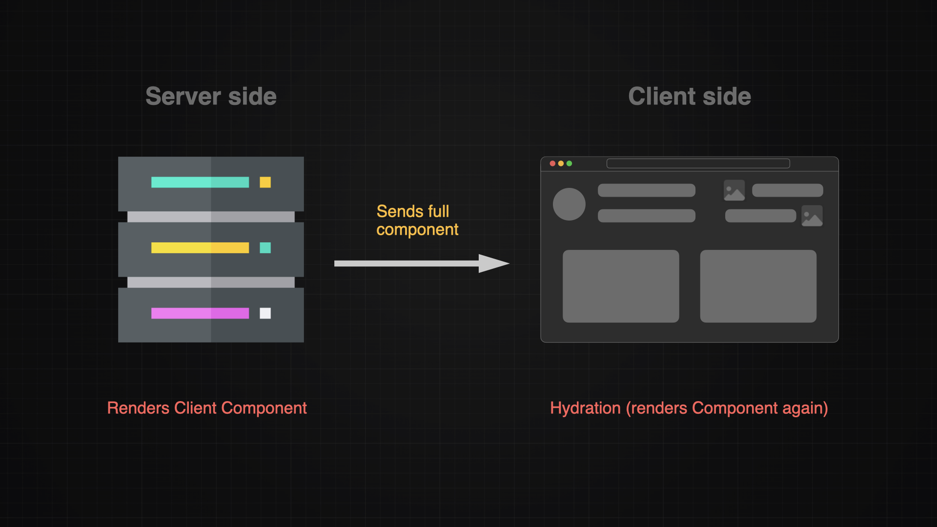 It might come surprisingly but client components are still rendered first on the server, then sent to the client and re-rendered once again. This re-rendering is called hydration and ultimately is responsible for enabling buttons, forms and states.